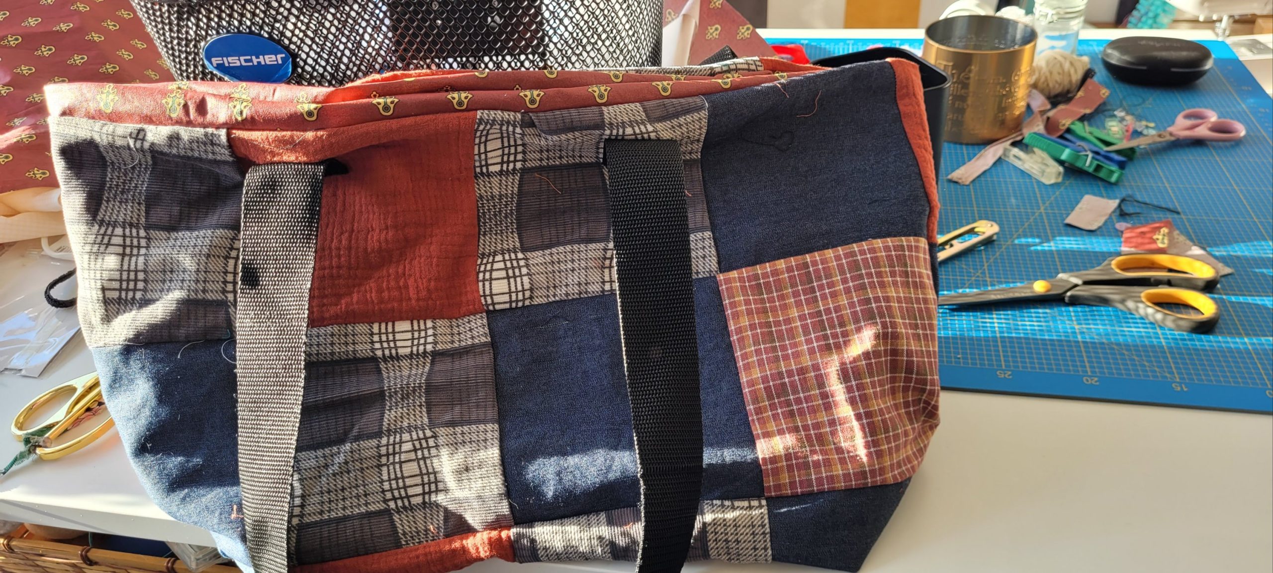 Extérieur en patchwork permettant d’utiliser des chutes ou les parties en bon état de jeans ou chemises : upcycling.